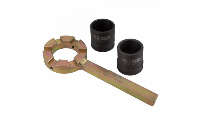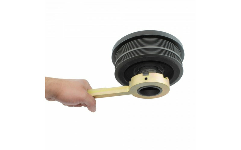 Gegenhalter inklusive erforderlichen Adapterringen, der beim Lösen der Mutter des Schwingungsdämpfers bei den BMW Modellen E39, E46, E60, E61, E81, E83, E90 und E91 benötigt wird.