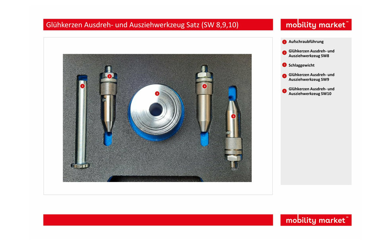 Zum schnellen, einfachen und fachgerechten Herausdrehen und gleichzeitigem Herausziehen / -schlagen von festsitzenden Glühkerzen. Universell passend für Diesel-Fahrzeuge mit SW 8, 9 oder 10 Glühkerzen. Besonders geeignet für Glühkerzen die zwar losgeschraubt sind, aber durch Verkokung oder defektem Gewinde im Schacht festsitzen. Selbst sehr festsitzende Glühkerzen können durch das Anbringen von Schlägen mit dem Schlaggewicht, bei gleichzeitigem Anbringen der maximal zulässigen Lösekraft über den Sechskant SW19 gelöst und ausgebaut werden. Durch die besondere Konstruktion wird die Dreh- und Zugkraft nur auf den Antriebs-Sechskant der Glühkerze ausgeübt. Kein Abriss der Mittelelektrode. Besonders stabile und hochwertige Edelstahlausführung.