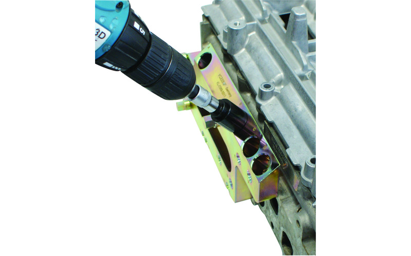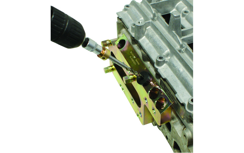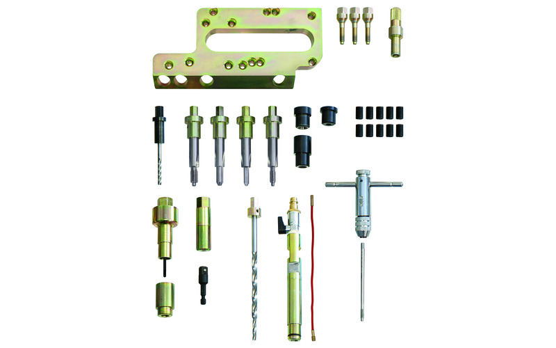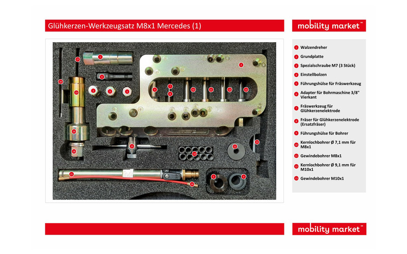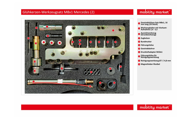 Der Glühkerzen-Werkzeugsatz ermöglicht das schnelle, präzise und fachgerechte Ausbohren von beschädigten bzw. abgerissenen Glühkerzen, das Nachscheiden, Reinigen oder Reparieren des Glühkerzen-Aufnahmegewindes und das Reinigen der Glühkerzenbohrung. Die Glühkerze bzw. der Glühkerzenkopf wird mit dem Kernlochbohrer aus- bzw. aufgebohrt. Anschließend wird das Originalgewinde mit dem Spezial-Gewindebohrer nachgeschnitten und gereinigt. Bei beschädigten Glühkerzen-Aufnahmegewinden wird dies mit dem Aufmass-Gewindebohrer auf M10x1 aufgebohrt. Die Zentrier- und Führungshülsen gewährleisten, in Verbindung mit der Grundplatte, eine exakte und präzise Zentrierung und Führung sowie eine genaue Bohrungstiefe beim Ausbohren und der Gewindereparatur. Der verbleibende Glühkerzenkörper wird mit dem Auszieher herausgezogen. Die Glühkerzenbohrung, der Dichtsitz und der Glühstiftkanal wird anschließend mit dem Reinigungswerkzeug gereinigt. Passend für Mercedes CDI Dieselmotoren OM640 und OM642 mit Glühkerzengewinde M8x1.