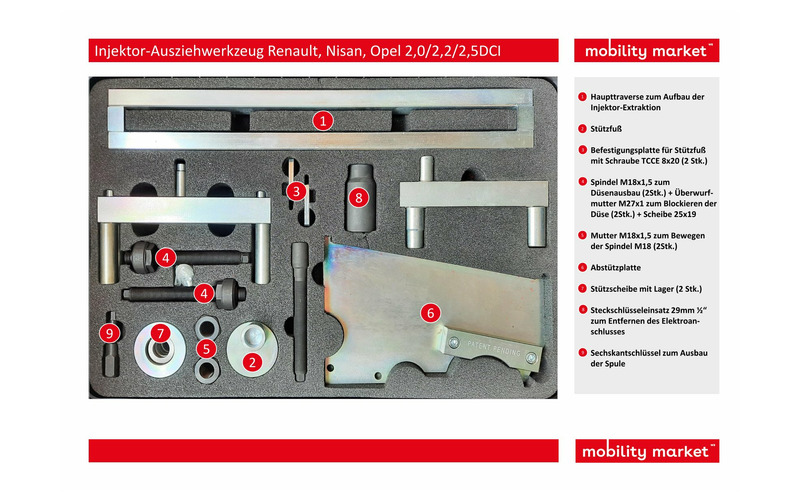 Mit diesem Werkzeug ist es möglich die Injektoren von Renault, Nissan und Opel mit den 2,0/2,2/2,5 dCi Dieselmotoren zu extrahieren.