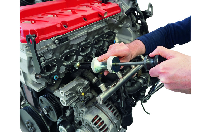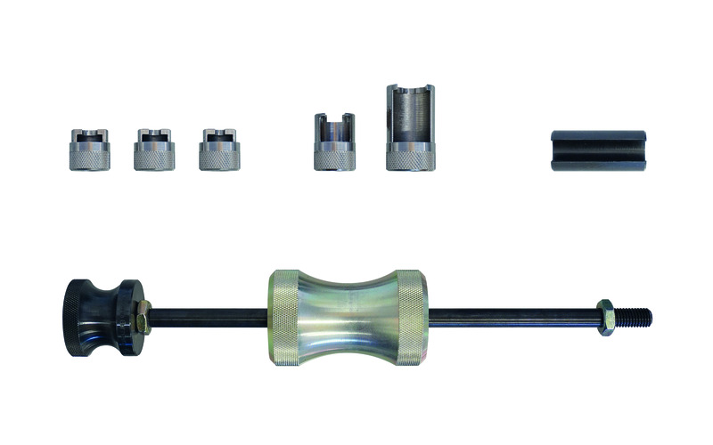 Zum schnellen und fachgerechten Herausziehen von Injektoren an Benzin-Direkteinspritzer-Motoren. Erforderlich z.B. beim Austausch der Injektoren sowie beider Demontage des Ventildeckels. Dazu wird der Injektor mit Hilfe des Schlagausziehers gelöst und herausgezogen. Die unterschiedlichen Abzieher ermöglichen dabei ein sicheres Eingreifen am Injektor. Inklusive Injektoren-Instandsetzungs-Satz zur beschädigungsfreien Montage der Brennraumdichtringe (Teflondichtring) und O-Ringe (kraftstoffseitig) an Benzin-Direkteinspritzer-Injektoren. Vor dem Wiedereinbau eines gebrauchten Injektors müssen laut Herstellervorgaben die Dichtringe ersetzt werden. Dazu werden die neuen Dichtringe einfach über den Montagekegel mit Hilfe des Kalibrierwerkzeuges auf den Injektor aufgeschoben. Der Brennraumdichtring wird zusätzlich in 2-Stufen am Dichtsitz verengt (kalibriert). Ein neuer Brennraumdichtring, der beim Einbau nicht verengt wurde, kann beim Wiedereinbau des Injektors mit hoher Wahrscheinlichkeit beschädigt werden!“
