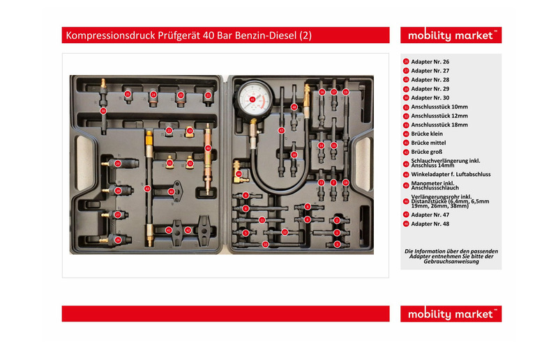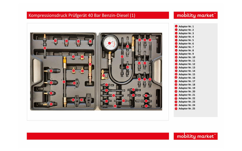 Werkzeug zum Kompressionsdruck prüfen bei sämtlichen Diesel und Benzinmotoren mit direkter und indirekter Einspritzung.