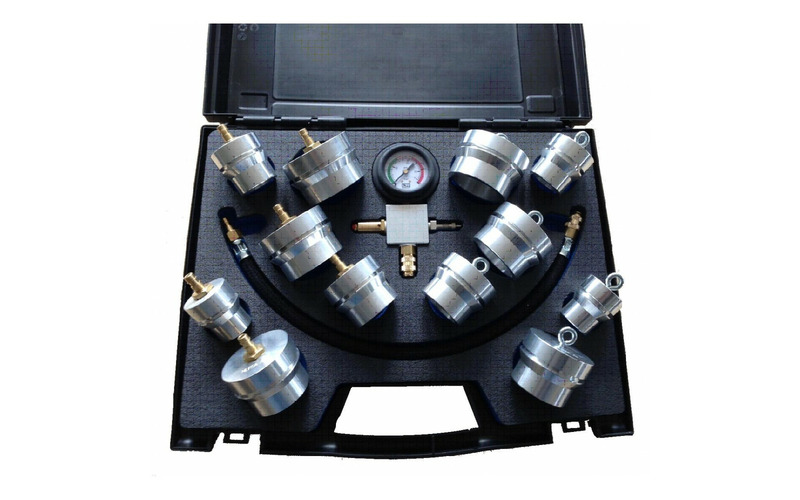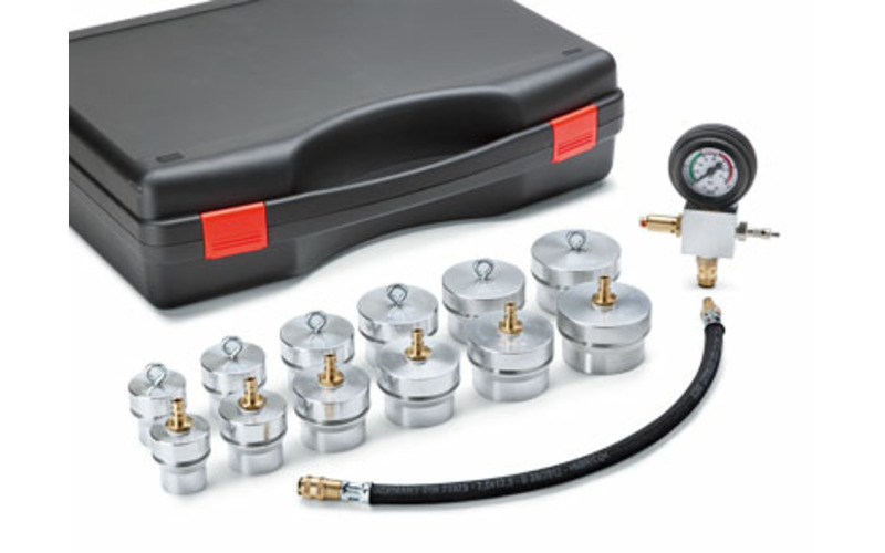 Passend für Fahrzeuge bei denen die Ladeluftrohre mit Klicksystem verbunden sind. Zur schnellen Diagnose des Ladeluftsystems. Dichtigkeitsprüfung und Leckageortung. Verschlussstopfen und Adapter aus Aluminium. Mit Sicherheitsventil für Überdruckschutz, prozesssicher und wartungsfrei. Anzeige 0…2,5 bar.
