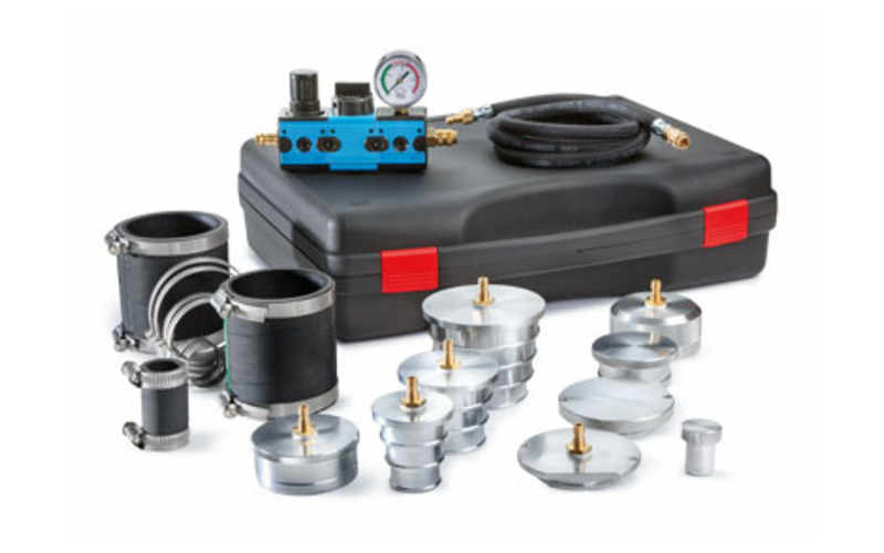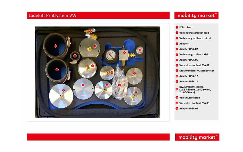 Zur schnellen Diagnose des Ladeluftsystems. Dichtheitsprüfung und Leckageortung. Stopfen und Adapter aus Aluminium. Besonders passend für VW, Audi, Seat, Skoda und Porsche Benzinmotoren.