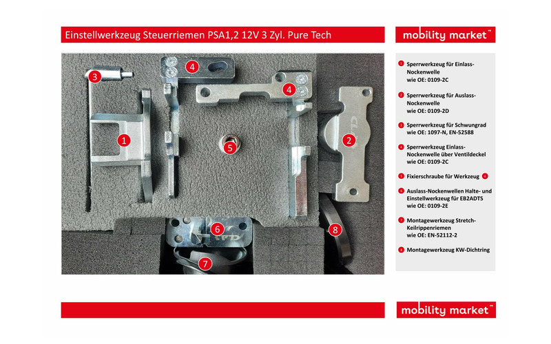 dieser Werkzeugsatz dient zum einfachen Tausch des Zahnriemens bei 1,2 12V 3 Zylinder Pure Tech Motoren von Citroen, Peugeot, Opel und Toyota, ohne dass der Kipphebeldeckel abgenommen werden muss.
