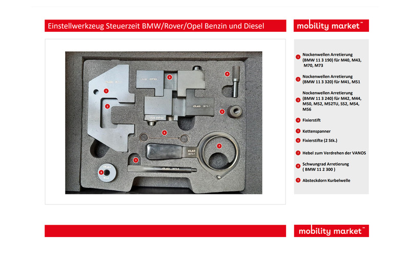 Werkzeugsatz mit dem Sie die Nockenwelle und die Kurbelwelle beim Wechseln des Zahnriemens richtig positionieren können.
