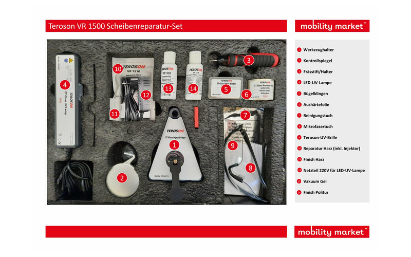 Dieses Werkzeug enthält alle Komponenten für eine professionelle Reparatur von Windschutzscheiben.